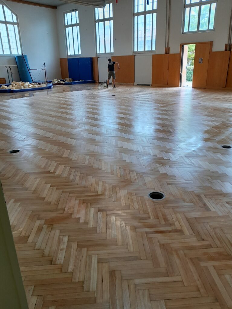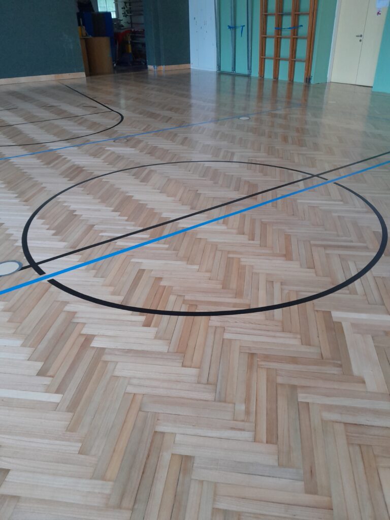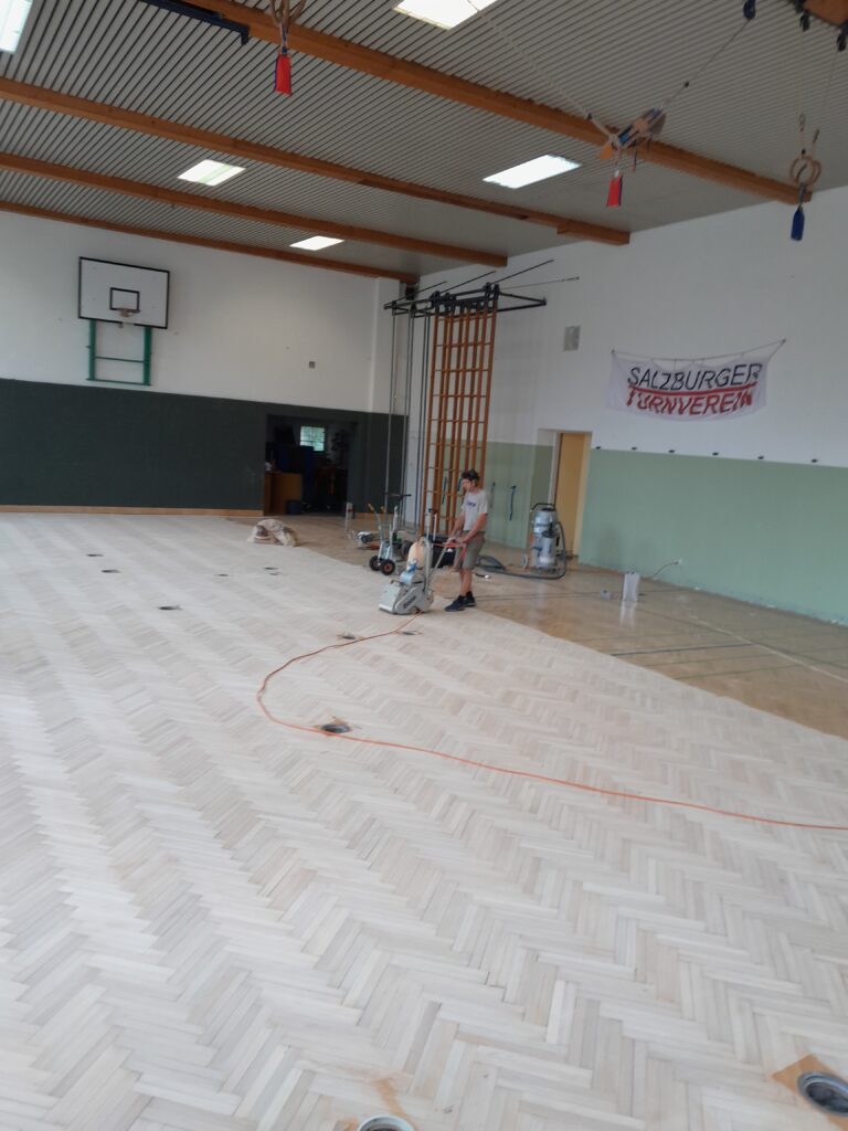 Am ersten Ferientag wurde die Halle gesperrt und die Sanierung (reparieren, schleifen, grundieren, noch einmal schleifen, 2 x versiegeln, neue Sportlinien für Basketball und Volleyball auftragen sowie die Wandfläche hinter den Sprossenwänden neu streichen) begonnen.